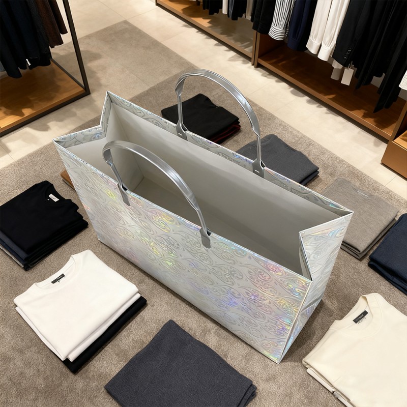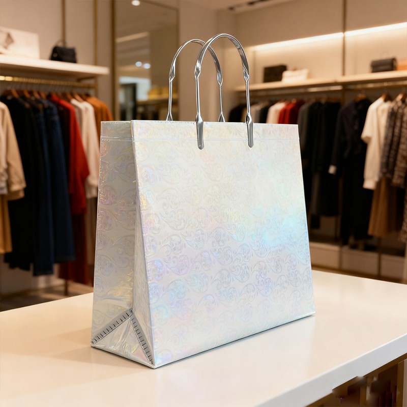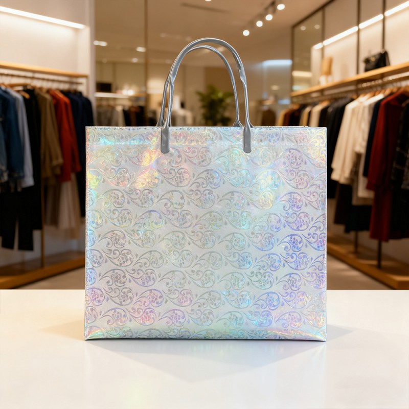 Sprankelend oppervlak: de glitterfilm is ingebed met fijne, hoogwaardige glitterdeeltjes die licht vanuit elke hoek opvangen en reflecteren, waardoor een boeiende, multidimensionale schittering ontstaat. Dit trekt meteen de aandacht en zorgt voor een gevoel van opwinding en feest. Luxe textuur: In tegenstelling tot afbladderende glitter behoudt onze gelamineerde film permanent zijn glans onder een gladde beschermlaag. Dit zorgt voor een schone en opgeruimde gebruikerservaring en biedt tegelijkertijd een comfortabel tastgevoel. Herbruikbaar ontwerp: de combinatie van een stevige papieren kern en een stevig gelamineerd oppervlak zorgt ervoor dat deze tas lang meegaat. Het vermogen om zijn glans in de loop van de tijd te behouden, stimuleert herhaald gebruik, waardoor uw klanten lang na de eerste aankoop wandelende merkambassadeurs worden. Prachtige afdrukken: ons ontwerpteam kan patronen ontwerpen volgens uw vereisten en deze op het product presenteren met onze geavanceerde apparatuur en geavanceerde technologie. Uw logo en ontwerp kunnen in heldere en levendige kleuren worden aangebracht, waardoor een mooi contrast ontstaat met een sprankelende achtergrond om maximale naamsbekendheid te bereiken. Gepersonaliseerd maatwerk: Klanten kunnen kleuren veranderen, handvatten vervangen, specifieke patronen toevoegen en maten aanpassen aan hun vereisten. Bied buitengewone flexibiliteit om aan uw specifieke merkkleuren en functionele vereisten voor verschillende evenementen te voldoen.